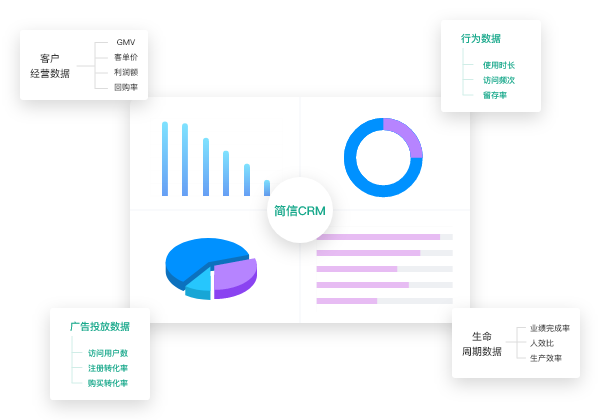 結合簡信CRM各個模塊的使用,匯聚多類用戶數據,通過整合分析,完成客戶的統一識別,構建精準360°客戶畫像。