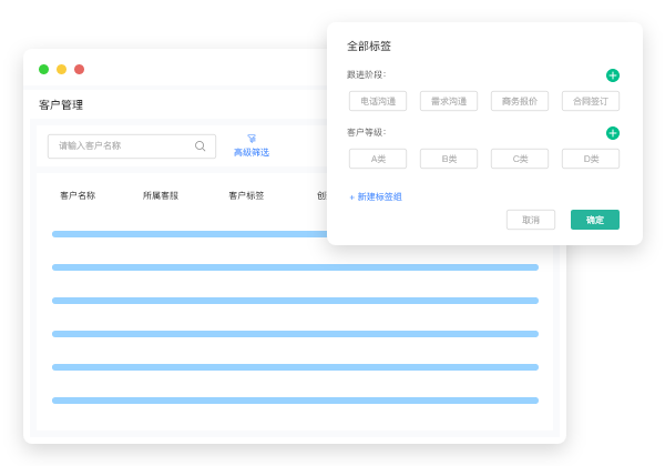 多種客戶分組創建方式,輕松完成客戶篩選,全局搜索功能更能有助于快速定位客戶標簽。